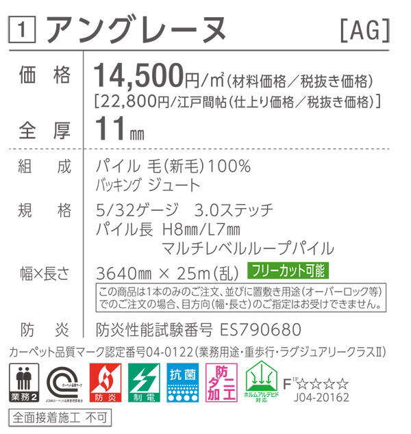 カーペット サイズ オーダー じゅうたん ロール カット パイル 防炎 抗菌 防ダニ 制電 新生活 カーペット 自由サイズ 春夏秋冬 引越 洋室 和室東リオーダーロールカーペット アングレーヌの販売 こちらのページでは東リのオーダーカーペットのカタログ「東リロールカーペット2019-2022」掲載商品アングレーヌ(コンフォートウール)AG1412,AG1413,AG1414が自動見積りでオーダーサイズをご購入頂けます。